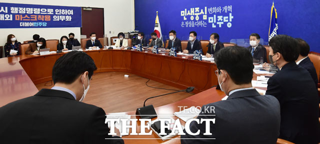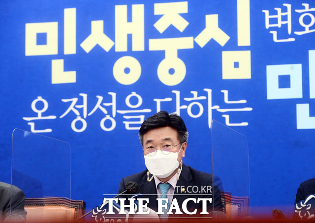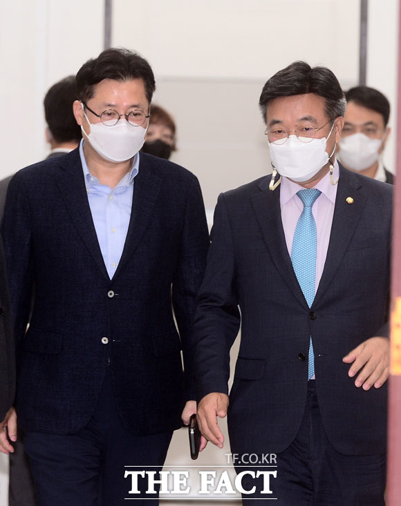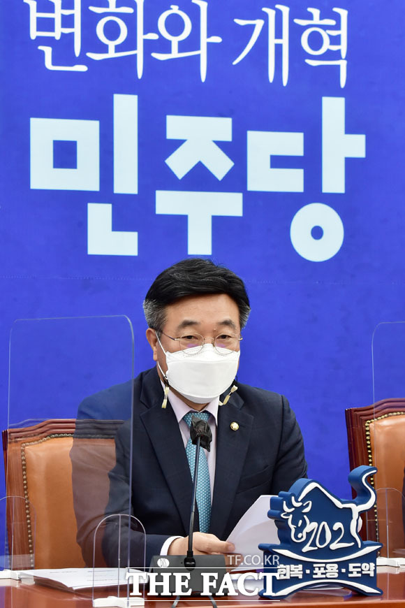 [더팩트ㅣ국회=남윤호 기자] 윤호중 더불어민주당 원내대표 겸 비상대책위원장(가운데)이 20일 오전 서울 여의도 국회에서 열린 더불어민주당 원내대책회의에 참석해 고개숙여 인사하고 있다.