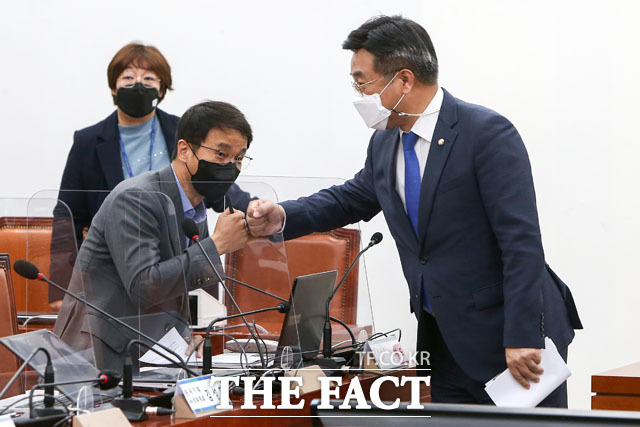 [더팩트ㅣ국회=남윤호 기자] 더불어민주당 윤호중 비상대책위원장(오른쪽)이 21일 오전 서울 여의도 국회에서 열린 화상 의원총회에 참석해 한병도 원내수석부대표와 인사하고 있다.