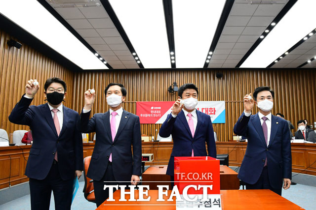[더팩트ㅣ국회=남윤호 기자] 국민의힘 원내대표 경선에 나선 김태흠, 권성동, 유의동, 김기현 의원(왼쪽부터)이 26일 오후 서울 여의도 국회에서 열린 '초선들과의 대화-원내대표 후보에게 듣는다' 토론회에 참석해 기념촬영을 하고 있다.
