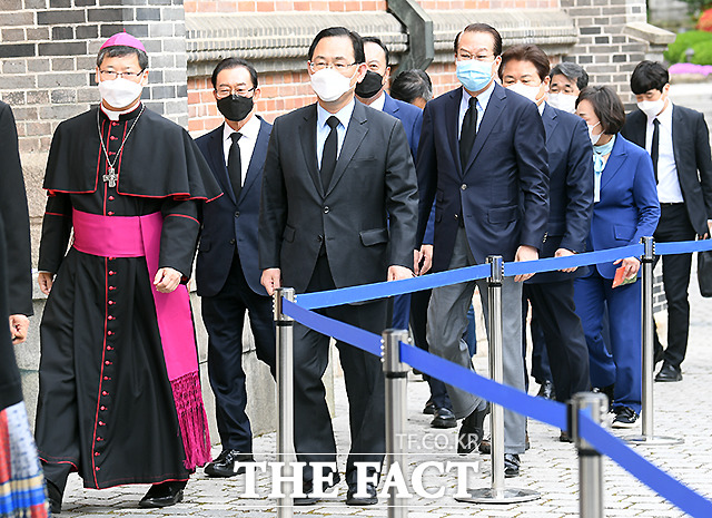 [더팩트ㅣ이새롬 기자] 주호영 국민의힘 대표 권한대행 겸 원내대표와 지도부가 28일 서울 명동성당을 찾아 27일 노환으로 선종한 정진석 추기경 조문을 위해 성당에 들어서고 있다.