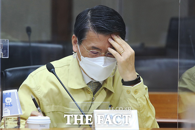 [더팩트ㅣ임영무 기자] 은성수 금융위원장이 29일 오전 서울 영등포구 여의도동 수출입은행에서 열린 제34차 비상경제 중앙대책본부 회의 겸 2021년 2차 혁신성장전략회의에 참석해 생각에 잠겨 있다.