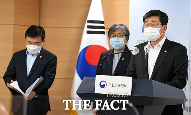 [더팩트ㅣ임영무 기자] 전해철 행정안전부 장관(오른쪽)이 3일 오후 서울 종로구 정부서울청사에서 열린 코로나19 대응 특별방역점검회의 브리핑에서 발언을 하고 있다.
