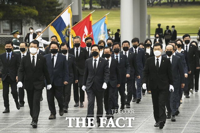 [더팩트ㅣ국회사진취재단] 김기현 국민의힘 대표 권한대행 겸 원내대표와 의원들이 4일 오전 서울 동작구 국립서울현충원을 찾아 현충탑 참배에 나서고 있다.