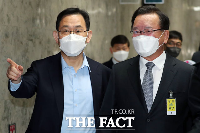[더팩트ㅣ국회=남윤호 기자] 김부겸 국무총리 후보자(오른쪽)가 6일 오전 서울 여의도 국회에서 열린 인사청문회에 출석하며 주호영 국민의힘 전 원내대표와 대화하고 있다.