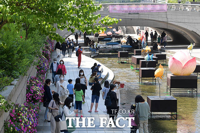 [더팩트ㅣ남용희 기자] 초여름 날씨가 이어지는 19일 오후 서울 종로구 청계천을 찾은 시민들이 휴일을 보내고 있다.