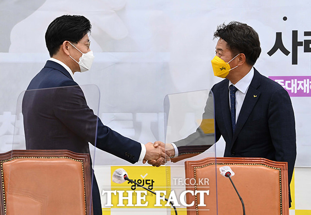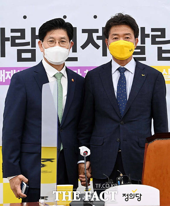[더팩트ㅣ국회=이선화 기자] 노형욱 국토교통부 장관(왼쪽)이 20일 오후 서울 여의도 국회에서 여영국 정의당 대표를 예방해 기념촬영을 하고 있다.