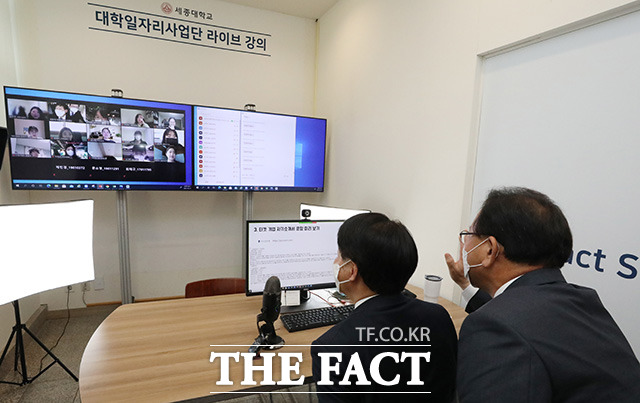 [더팩트ㅣ임영무 기자] 김부겸 국무총리(오른쪽)와 안경덕 고용노동부 장관이 21일 오후 서울 광진구 세종대학교 대학일자리센터 현장을 찾아 언텍트 스튜디오에서 영상강의를 듣는 학생들과 인사를 하고 있다.