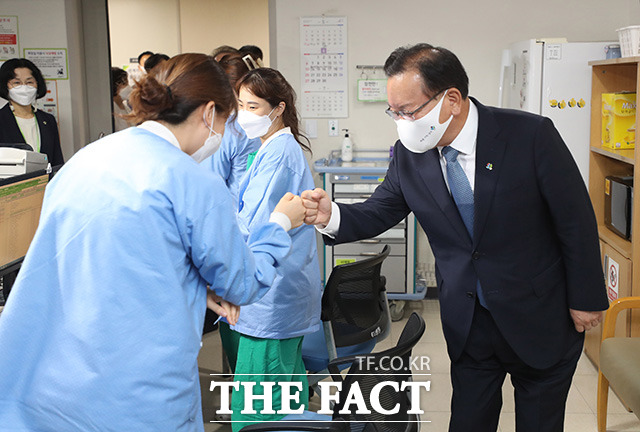 [더팩트ㅣ임영무 기자] 김부겸 국무총리(오른쪽)가 3일 오후 서울 강동구 중앙보훈병원 감염병동 간호사실을 찾아 간호사들을 격려하고 있다.