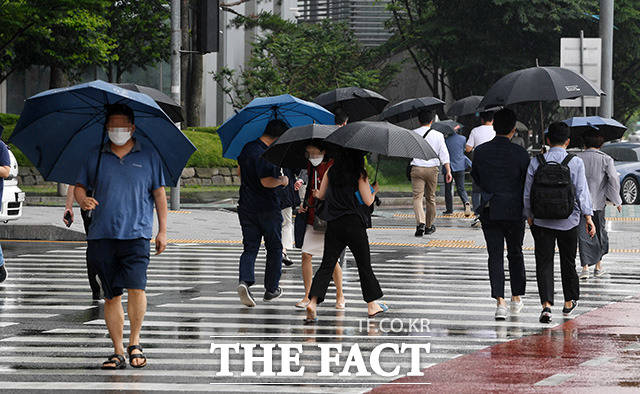 [더팩트ㅣ남용희 기자] 전국 곳곳에 비가 내리는 15일 오전 서울 영등포구 여의도 일대에서 우산을 쓴 시민들이 발걸음을 재촉하고 있다.