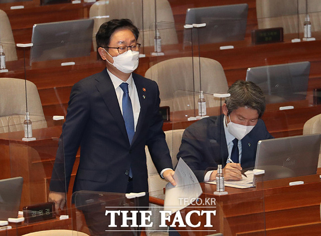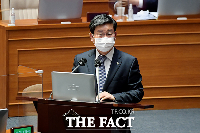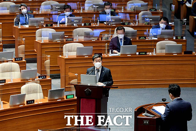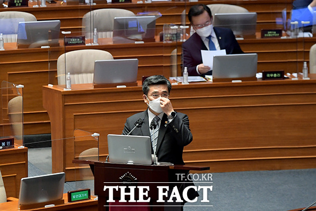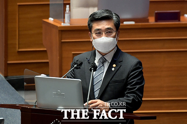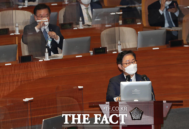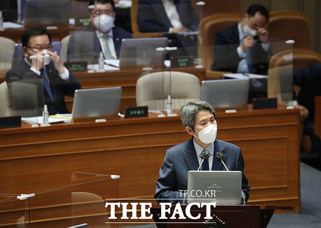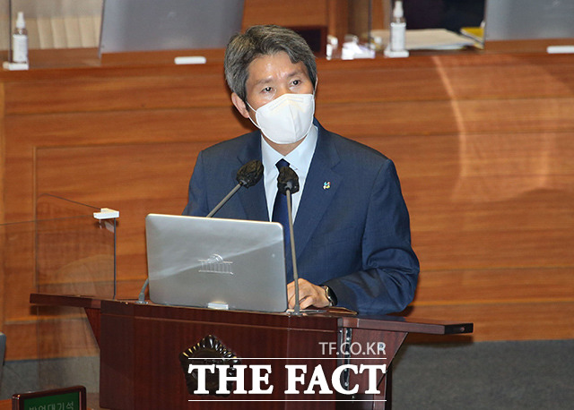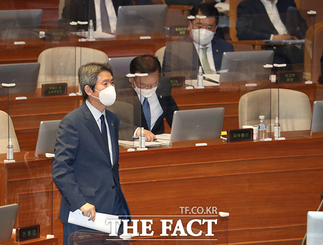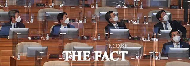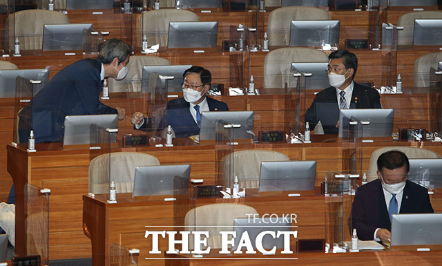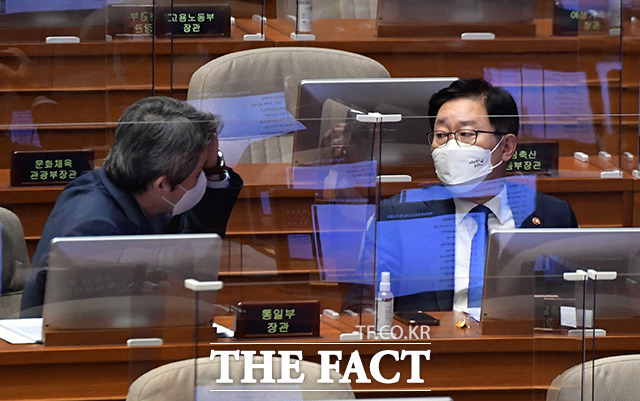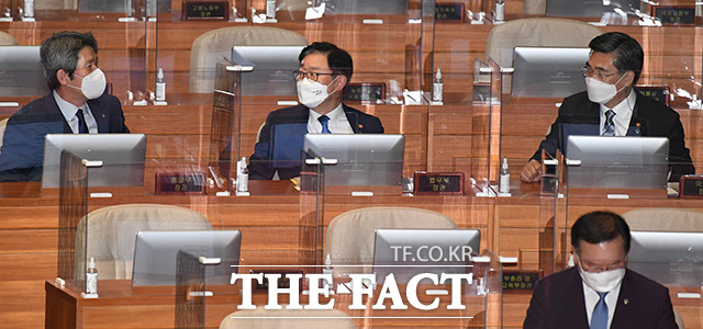 [더팩트ㅣ국회=이선화 기자] 박범계 법무부 장관과 서욱 국방부 장관, 전해철 행정안전부 장관, 이인영 통일부 장관(왼쪽부터)이 22일 오후 서울 여의도 국회 본회의장에서 열린 정치·외교·통일·안보 분야 대정부질문에 출석해 의원들의 질의에 답하고 있다.
