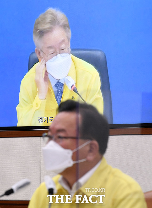 [더팩트ㅣ임영무 기자] 이재명 경기도지사가 29일 오전 서울 종로구 세종대로 정부서울청사에서 열린 코로나19 대응 중앙재난안전대책본부(중대본) 회의에 화상으로 참석해 발언을 하고 있다.