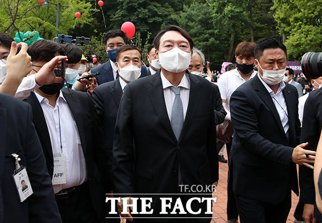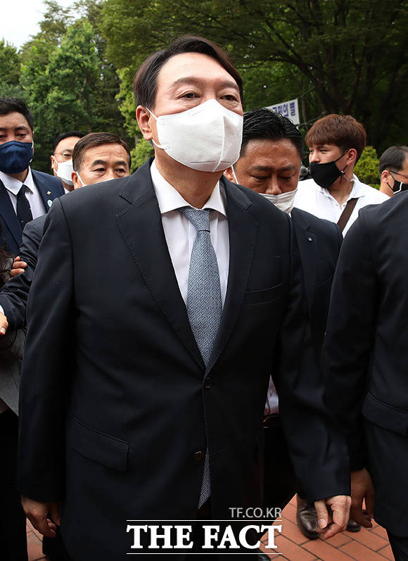 [더팩트ㅣ이선화 기자] 윤석열 전 검찰총장이 29일 오전 대선 출마 기자회견을 위해 서울 서초구 매헌 윤봉길 의사 기념관으로 이동하고 있다.