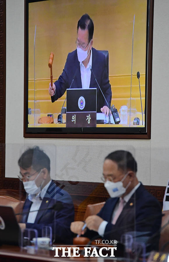 [더팩트ㅣ임영무 기자] 홍남기 경제부총리 겸 기획재정부 장관(오른쪽)이 1일 오전 서울 종로구 정부서울청사에서 열린 임시 국무회의에 참석해 있다. 김부겸 국무총리는 정부서울청사에서 화상 회의를 통해 의사봉 두드리고 있다.