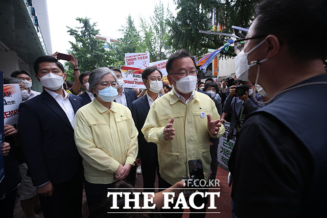 [더팩트ㅣ사진공동취재단] 김부겸 국무총리(가운데)와 정은경 질병관리청장이 2일 오전 서울 중구 정동 민주노총을 방문해 코로나19 확산의 기로에 서 있는 중차대한 시기임을 고려해 주말 대규모 집회 자제를 요청하고 있다.darkroom@tf.co.kr사진영상기획부 photo@tf.co.kr