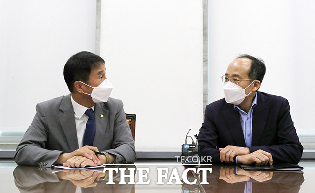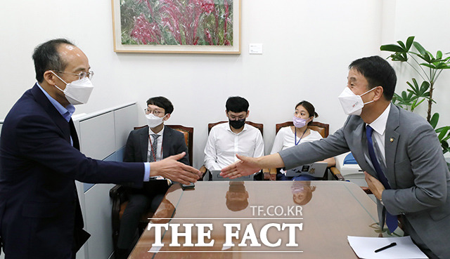 [더팩트ㅣ국회=이선화 기자] 한병도 더불어민주당 원내수석부대표(왼쪽)와 추경호 국민의힘 원내수석부대표가 5일 오전 서울 여의도 국회에서 7월 임시국회 의사일정을 논의하기 위한 회동을 갖기에 앞서 인사를 나누고 있다.