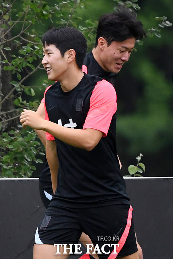 [더팩트ㅣ파주=남용희 기자] 2020 도쿄올림픽 축구대표팀 이강인(왼쪽)과 황의조가 5일 오후 경기도 파주NFC에서 진행된 공개 훈련에서 몸을 풀고 있다.