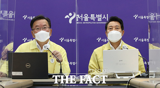 [더팩트ㅣ임영무 기자] 김부겸 국무총리(왼쪽)가 6일 오전 서울 중구 서울시청에서 열린 수도권 방역 특별점검회의에 참석해 발언하고 있다. 오른쪽은 오세훈 서울시장.
