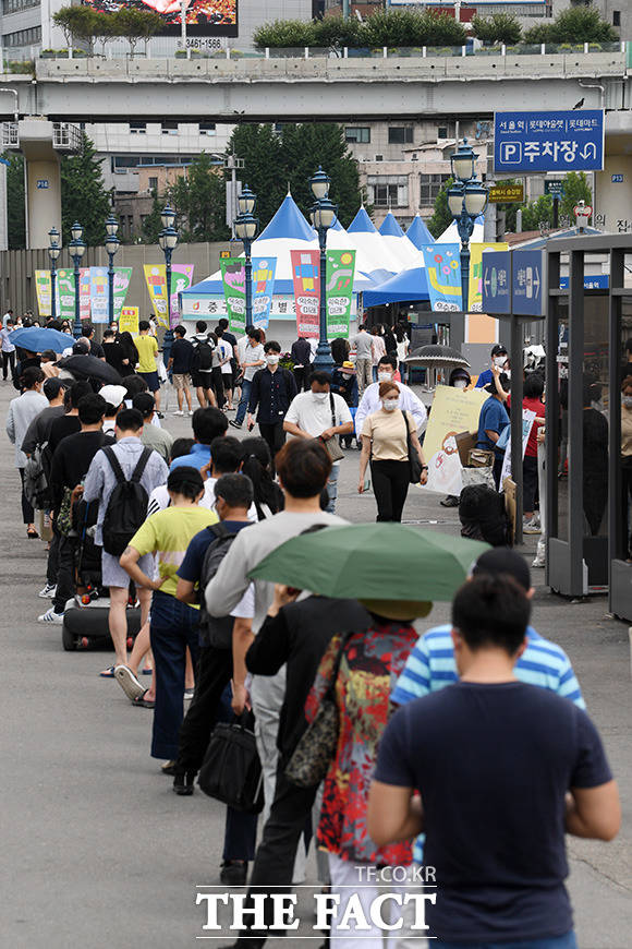 [더팩트ㅣ남용희 기자] 코로나19 신규 확진자가 1천 200명을 넘어선 7일 오전 서울 용산구 서울역 광장에 마련된 코로나19 임시선별검사소에 시민들이 검사를 받기 위해 줄을 서고 있다.