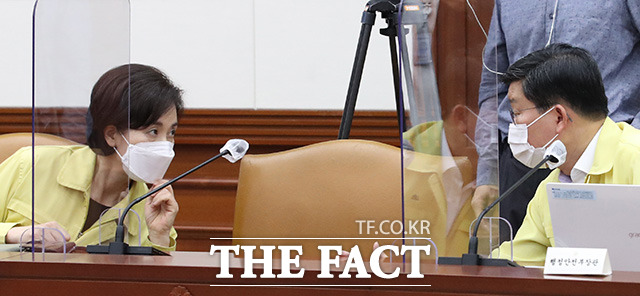 [더팩트ㅣ임영무 기자] 유은혜 사회부총리 겸 교육부 장관(왼쪽)과 전해철 행정안전부 장관이 14일 오전 서울 종로구 정부서울청사에서 열린 코로나19 중앙재난안전대책본부(중대본) 회의에 참석해 대화하고 있다.