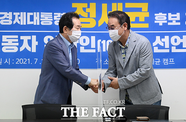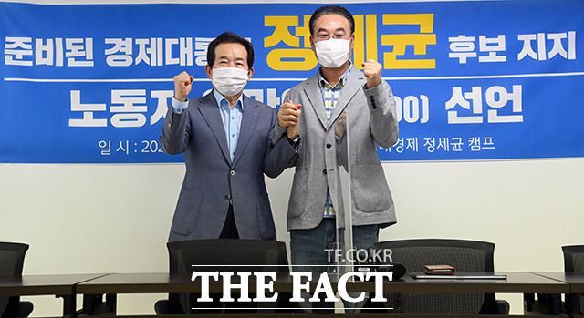 [더팩트ㅣ이선화 기자] 대선 출마 선언한 정세균 전 국무총리(왼쪽)가 16일 오전 서울 여의도 선거캠프에서 열린 '준비된 경제 대통령 정세균 후보 지지 노동자 일만인 선언'에서 강신표 한국노총 수석부위원장과 손잡고 기념촬영을 하고 있다.
