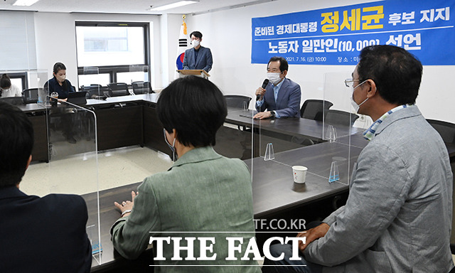 이날 정 전 총리는 "여야 대선 후보자 중 민간 기업에서 월급쟁이를 한 사람이 누가 있나. 일자리를 만드는 경제 대통령, 정세균밖에 없다"라며 "국민의 땀이 차별받지 않는 사회를 만들고 노동 존중 문화를 정착시키겠다. 노동 존중 대통령이 되겠다"라고 포부를 밝혔다.