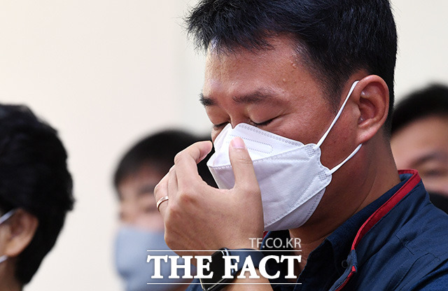 [더팩트ㅣ임영무 기자] 양경수 전국민주노동조합총연맹 위원장이 11일 오전 서울 중구 정동 민주노총에서 영장실질심사에 대한 입장 발표를 앞두고 마스크를 고쳐 쓰고 있다.darkroom@tf.co.kr사진영상기획부 photo@tf.co.kr