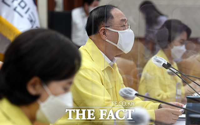 [더팩트ㅣ임영무 기자] 홍남기 경제부총리 겸 기획재정부 장관(가운데)이 12일 오전 서울 종로구 정부서울청사에서 열린 비상경제 중앙대책본부회의에 참석해 모두발언을 하고 있다.darkroom@tf.co.kr사진영상기획부 photo@tf.co.kr