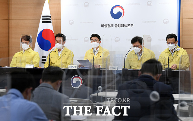 [더팩트ㅣ임영무 기자] 이억원 기획재정부 1차관(가운데)이 12일 오후 서울 종로구 정부서울청사에서 비상경제 중앙대책본부회의 정례브리핑을 하고 있다.darkroom@tf.co.kr사진영상기획부 photo@tf.co.kr