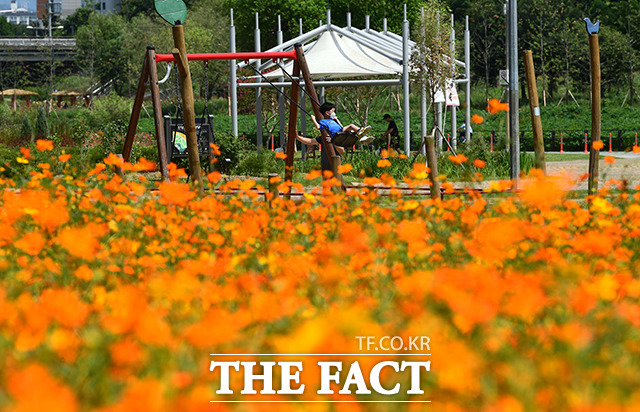 [더팩트ㅣ이동률 기자] 16일 오전 서울 양천구 안양천 생태공원을 찾은 시민들이 황화코스모스를 보며 즐거운 시간을 보내고 있다.