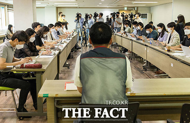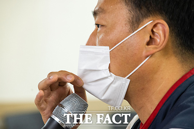 [더팩트ㅣ이새롬 기자] 7·3 노동자대회를 주도한 혐의로 구속영장이 발부된 양경수 민주노총위원장이 18일 오전 서울 중구 민주노총 회의실에서 출입기자단 간담회를 열고 발언하고 있다.