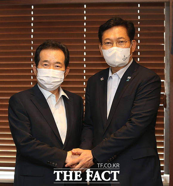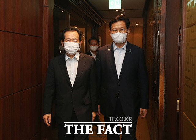 송 대표가 대권 주자인 정 전 총리와 만난 것은 지난 8일 이낙연 전 대표와 만찬 이후 두 번째다. 이날 만찬에서 송 대표는 정 전 총리에게 대선 경선 관리 및 당 운영과 관련된 전반적인 의견을 청취했다.