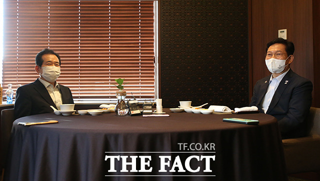 [더팩트ㅣ국회사진취재단] 송영길 더불어민주당 대표(오른쪽)와 당 대권 주자인 정세균 전 국무총리가 18일 오후 서울 여의도의 한 중식당에서 만찬 회동을 갖고 기념촬영을 하고 있다.