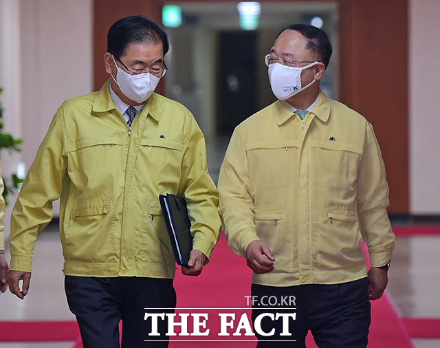 [더팩트ㅣ임영무 기자] 홍남기 경제부총리 겸 기획재정부 장관(오른쪽)과 정의용 외교부 장관이 24일 오전 서울 종로구 정부서울청사에서 열린 서울-세종 간 영상 국무회의에 참석하며 대화를 나누고 있다. darkroom@tf.co.kr사진영상기획부 photo@tf.co.kr