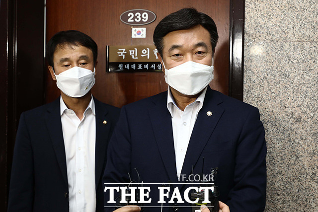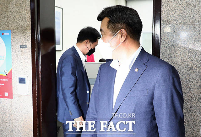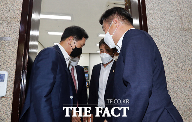 [더팩트ㅣ국회=이선화 기자] 윤호중 더불어민주당 원내대표(오른쪽)가 25일 오후 서울 여의도 국회에서 김기현 원내대표(왼쪽)를 방문해 본회의 일정 등의 논의를 마친 뒤 김 원내대표실을 나서고 있다.