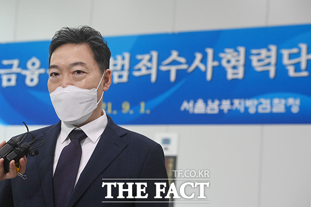 [더팩트ㅣ이선화 기자] 김오수 검찰총장이 1일 오전 서울 남부지검에서 열린 금융·증권범죄수사협력단 출범식에 참석해 현판식을 마치고 취재진의 질문을 듣고 있다.