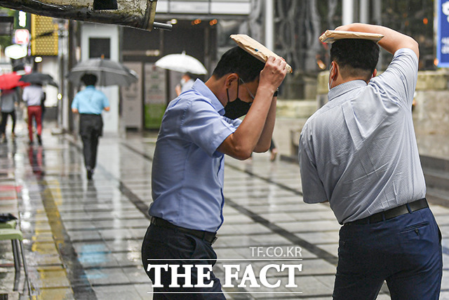 [더팩트ㅣ윤웅 기자] 이슬이 맺히며 가을의 시작을 알리는 절기상 '백로'인 7일 오전 서울 중구 광화문 일대의 직장인들이 서류뭉치로 머리를 가린 채 비를 피하고 있다.