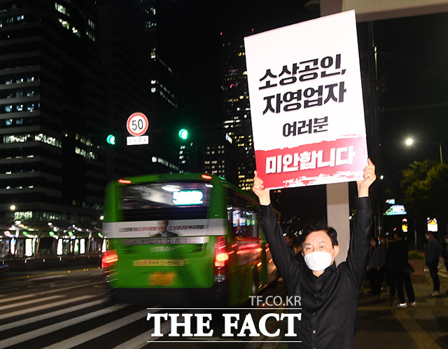 [더팩트ㅣ이동률 기자] 국민의힘 대선 경선 후보인 원희룡 전 제주지사가 9일 오전 서울 영등포구 여의도 환승센터 인근에서 팻말을 들고 자영업자 차량 시위를 지지하고 있다.