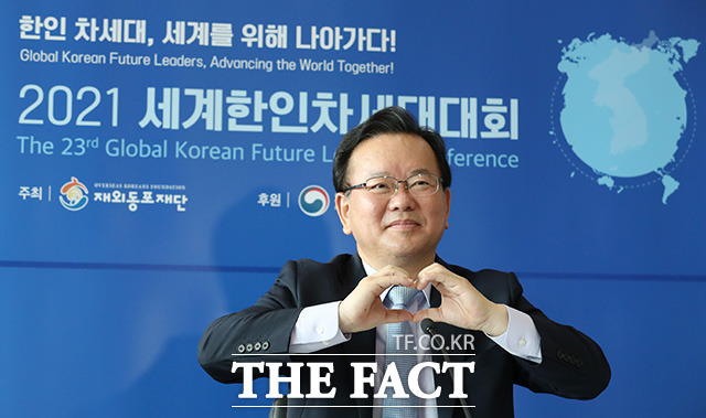 [더팩트ㅣ임영무 기자] 김부겸 국무총리가 9일 오전 서울 종로구 정부서울청사 별관에서 열린 세계한인차세대대회 화상간담회에 참석해 하트를 만들며 기념촬영 하고 있다.
