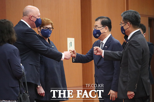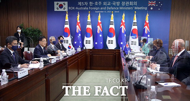 [더팩트ㅣ임영무 기자] 정의용 외교부 장관과 서욱 국방부 장관이 13일 오후 서울 종로구 도렴동 외교부 청사에서 호주의 마리스 페인 외교장관과 피터 더튼 국방장관이 참석한 가운데 한-호주 외교·국방 2+2 장관회의를 하고 있다.