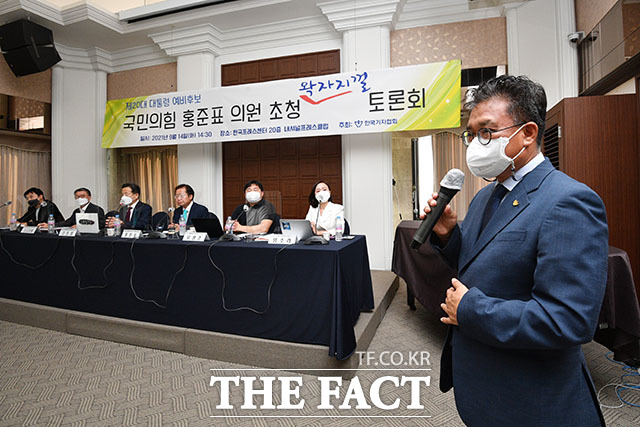 [더팩트ㅣ남윤호 기자] 김동훈 한국기자협회장(오른쪽)이 14일 오후 서울 중구 한국프레스센터에서 열린 한국기자협회 주최 국민의힘 홍준표 의원 초청 왁자지껄 토론회에서 환영사를 하고 있다.