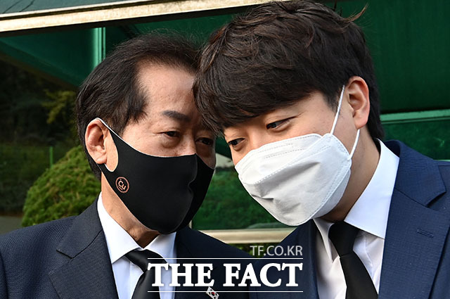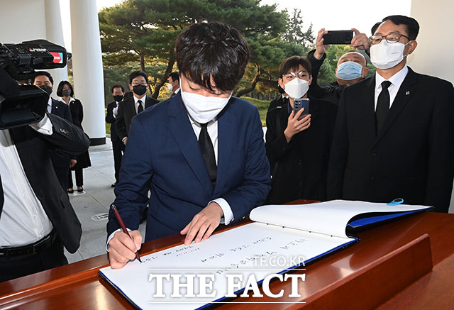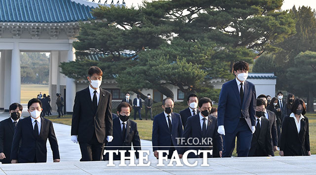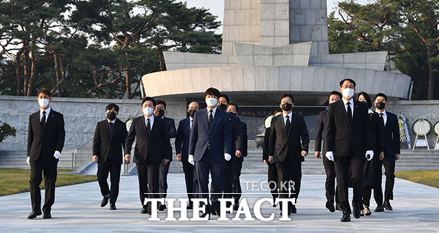 [더팩트ㅣ국회사진취재단] 이준석 국민의힘 대표(가운데)를 비롯한 지도부와 원희룡, 홍준표, 유승민 대선 경선 후보가 26일 오전 서울 동작구 국립서울현충원을 방문해 현충탑 참배를 하기 위해 이동하고 있다.