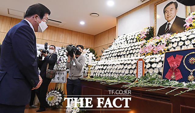 [더팩트ㅣ사진공동취재단] 박병석 국회의장이 27일 서울 종로구 서울대병원 장례식장에 마련된 고 노태우 전 대통령 빈소를 찾아 조문하고 있다.