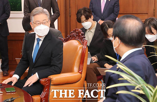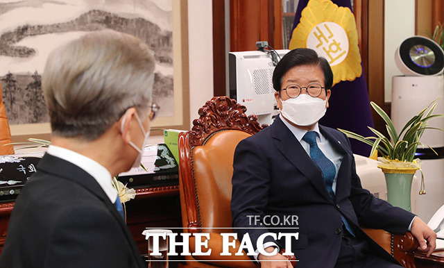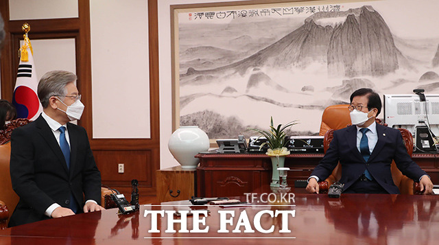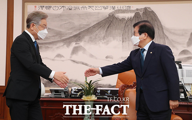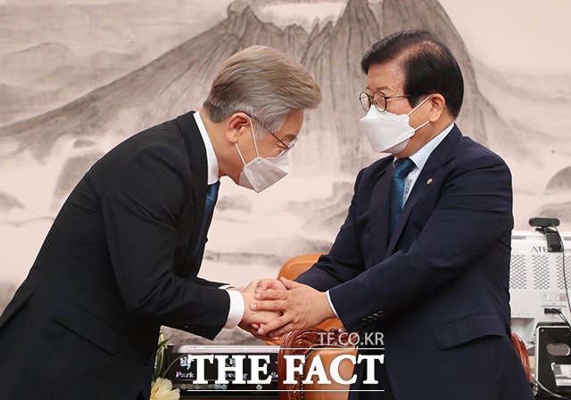 이날 이재명 후보는 국회를 찾아 박병석 의장을 예방, 국회 현안 등에 대해 논의했다.