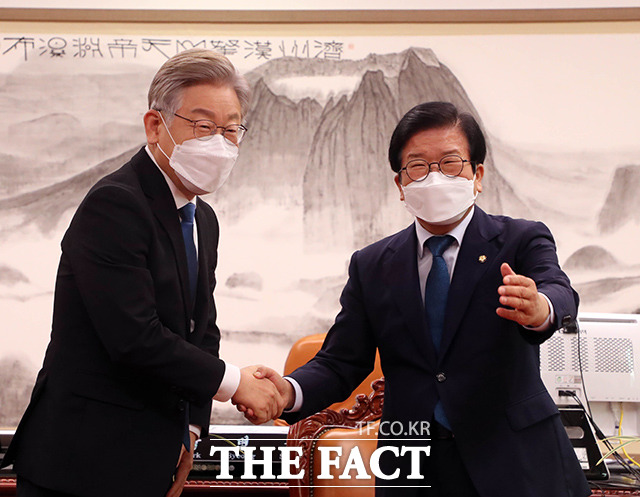 [더팩트ㅣ국회=이선화 기자] 이재명 더불어민주당 대선 후보(왼쪽)가 1일 오전 서울 여의도 국회에서 박병석 국회의장을 예방해 악수를 하고 있다.
