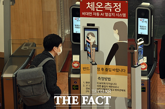 [더팩트ㅣ임영무 기자] 한상혁 방송통신위원장 코로나19 확진으로 김부겸 국무총리를 비롯한 국무위원들도 검사대상에 이름을 올린 가운데 5일 오전 서울 종로구 정부서울청사를 출근하는 공무원들이 발열체크를 하고 있다.