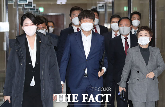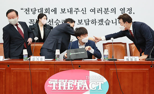 [더팩트ㅣ국회=남윤호 기자] 이준석 국민의힘 대표가 15일 오전 서울 여의도 국회에서 열린 최고위원회의에서 마스크를 만지고 있다.