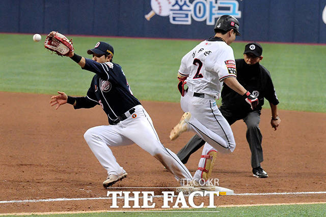 [더팩트|이선화 기자] 2021 KBO 포스트시즌 한국시리즈 2차전 KT 위즈와 두산 베어스의 경기가 15일 오후 서울 구로구 고척스카이돔에서 열린 가운데 5회말 KT 심우준이 번트 안타에 성공하고 있다.
