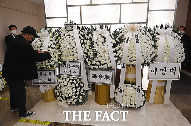 [더팩트ㅣ이새롬 기자] 대한민국 제11대, 12대 대통령을 역임했던 전두환 씨의 빈소 조문 이틀째인 24일 서울 서대문구 세브란스병원 신촌장례식장에 마련된 고인의 빈소에 박근혜 전 대통령 근조 화환이 들어가고 있다.