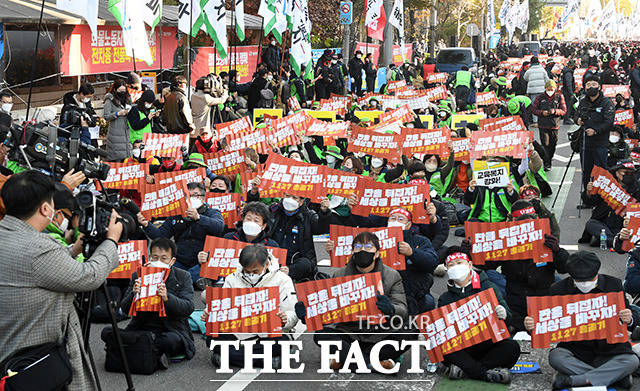 [더팩트ㅣ남용희 기자] 전국민주노동조합총연맹(민주노총) 공공운수노조 총궐기가 27일 오후 서울 영등포구 여의도역 일대에서 열린 가운데 노조원들이 구호를 외치고 있다.