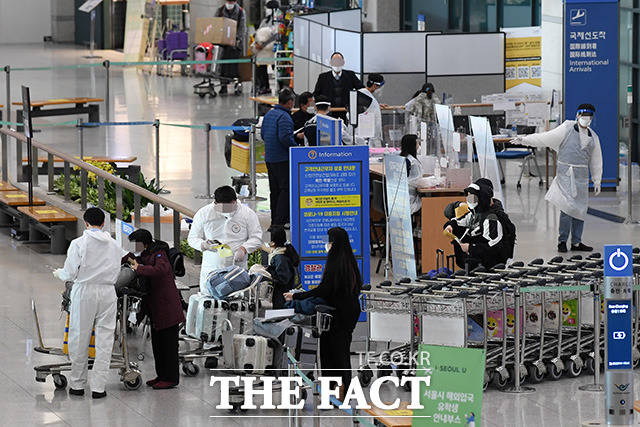 [더팩트ㅣ인천국제공항=남용희 기자] 3일 오전 인천국제공항 입국장에서 해외 입국객들이 방역 관계자들의 안내를 받고 있다.